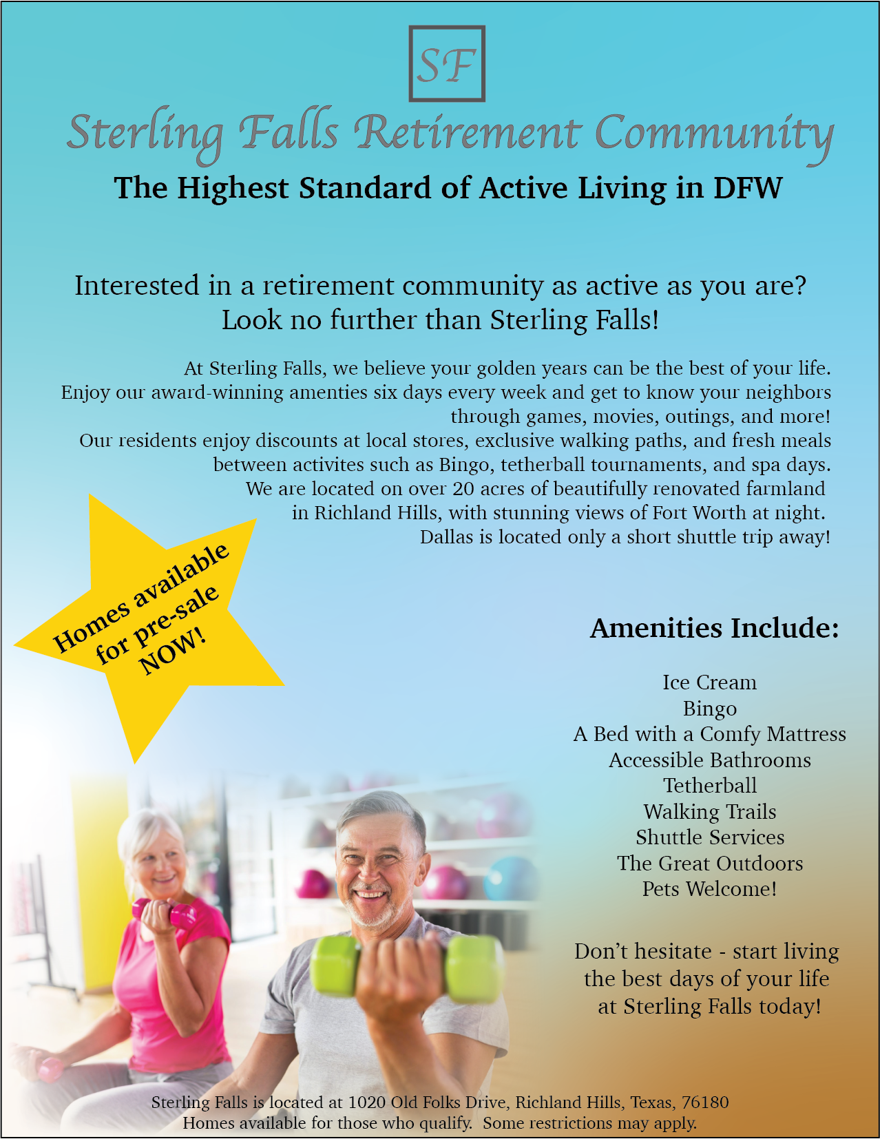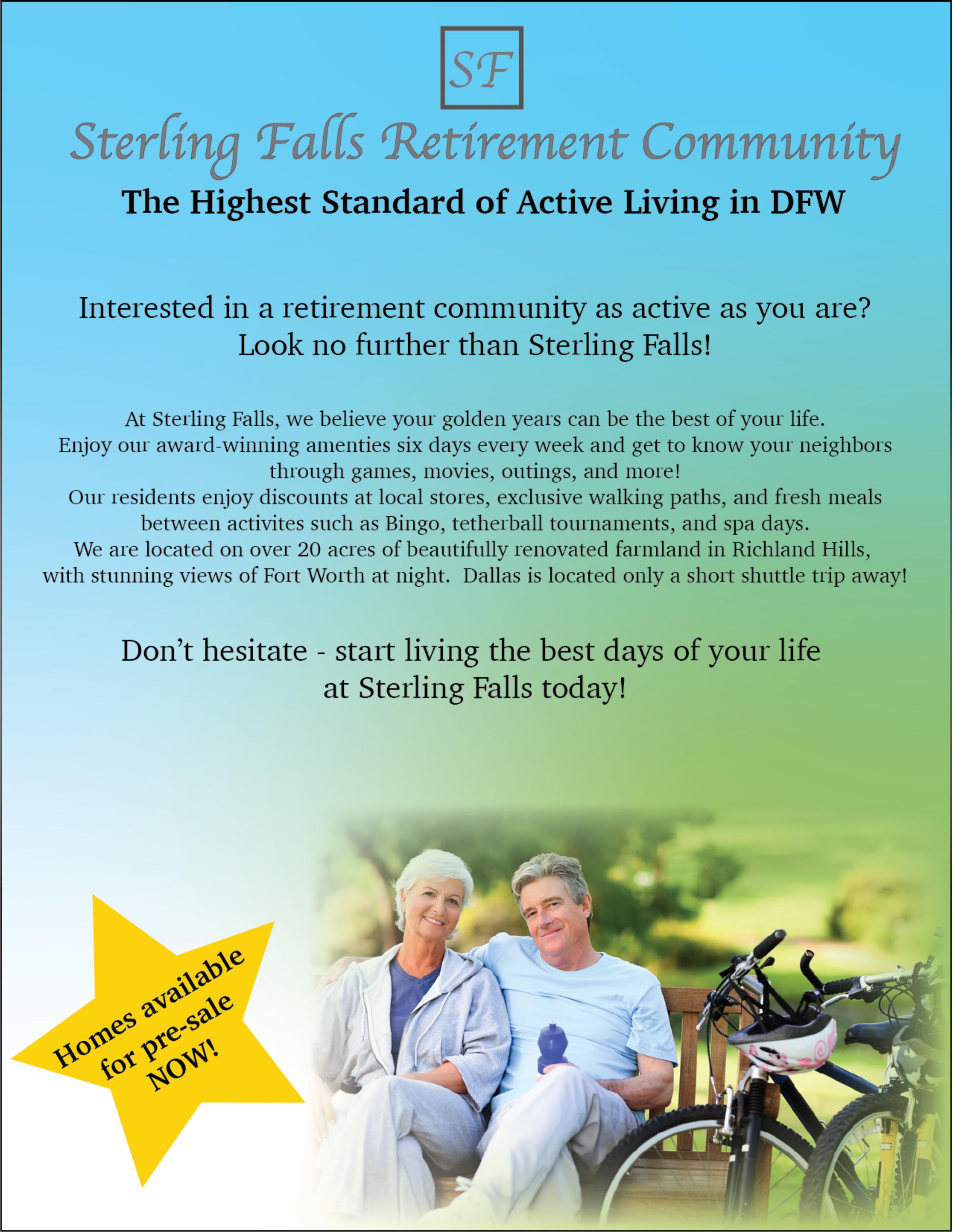 Made on Adobe Illustrator using stock photos I found through Google. Assignment was to design ads for a active living retirement community. I named my community ‘Sterling Falls’ 🙂