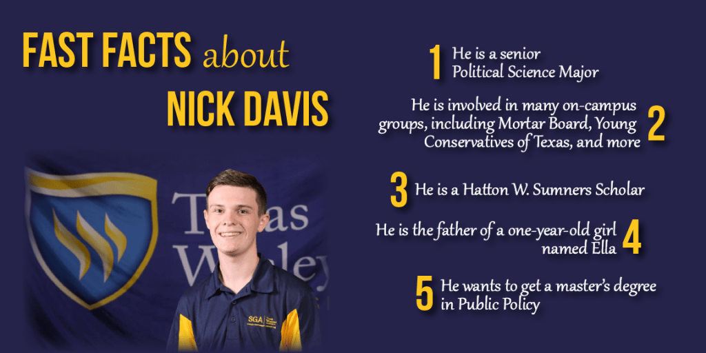 Davis is a senior political science major with a pre-law emphasis. He currently serves at Texas Wesleyan as the founding chair of the Young Conservatives of Texas, the President of Mortar Board, a Hatton W. Sumners Scholar, and a Texas Civic Ambassador. Davis has also served on the SGA as the Freshman Representative during his first year of college and has participated in the Pre-Professional Program (3PR) as well.