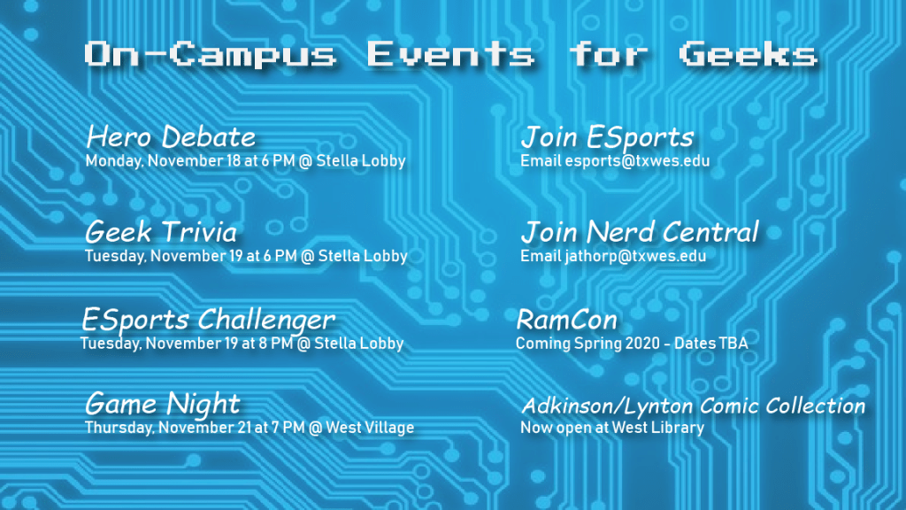On the Texas Wesleyan campus, being a geek has been popular for many years. Students have the opportunity to engage in groups that encourage embracing popular culture, including comic books, movies, gaming, cosplaying (that is, dressing up in costume for conventions,) and tv shows, among other subsets of geek culture. Because of the positive light that this lifestyle receives on campus, students are able to embrace this side of their personality without fear of scrutiny.